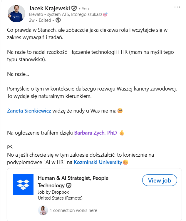 Zapowiada się bardzo ciekawie, a organizuje go Basia Zych i Ania Syrek-Kosowska, więc polecam z pełnym przekonaniem bo Basia i Ania znają się na temacie i potrafią świetnie przekazać swoją wiedzę. Temat jest zdecydowanie na czasie, a taki kurs (i certyfikat) może Ci pomóc w Twojej dalszej ścieżce zawodowej na styku HR i technologii.