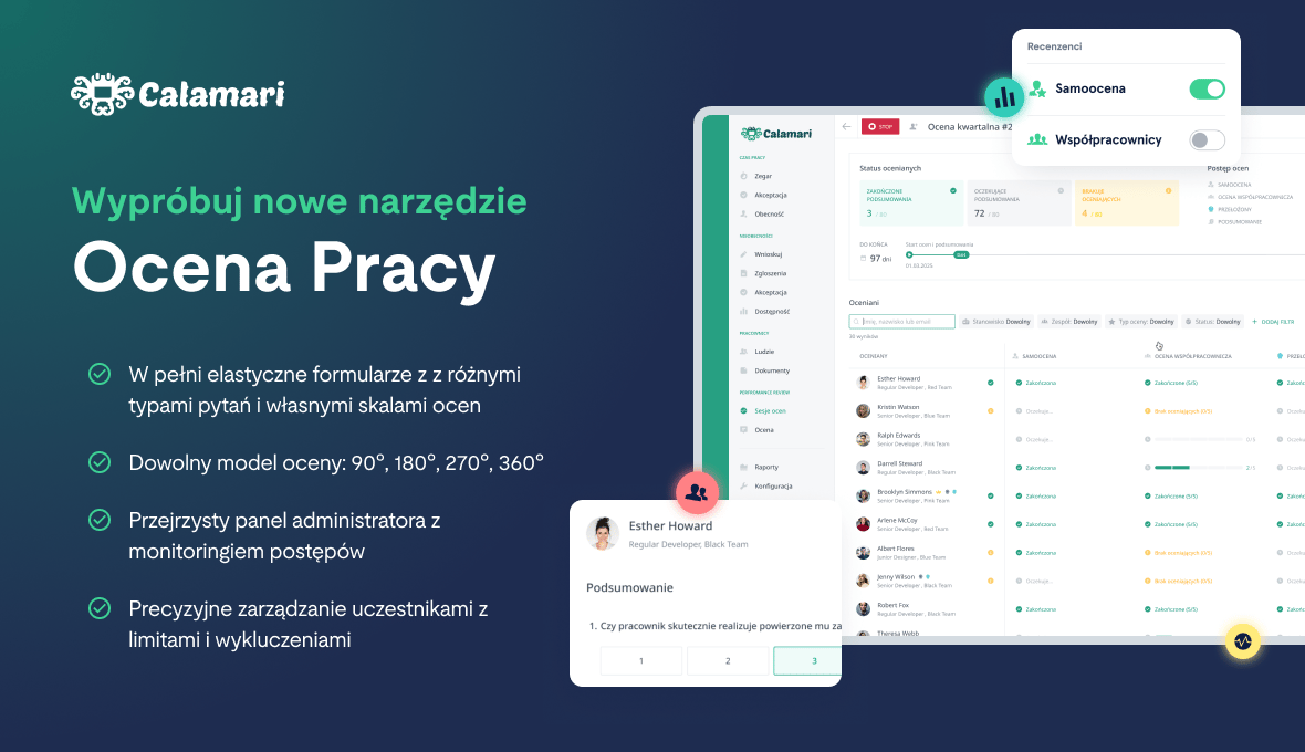 Na polskim rynku właśnie pojawiło się narzędzie, które zbiera cały ten rozproszony proces w jednym miejscu - nowy moduł Ocena Pracy od Calamari. Tworzysz formularz, system sam pilnuje odpowiedzi, a Ty dostajesz gotowe wyniki do rozmowy z pracownikiem.